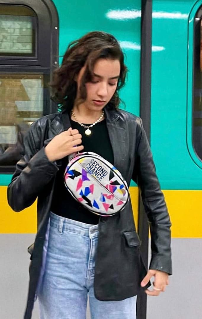 Made from repurposed billboard vinyl with recycled‑cotton lining; water‑resistant and wipe‑clean