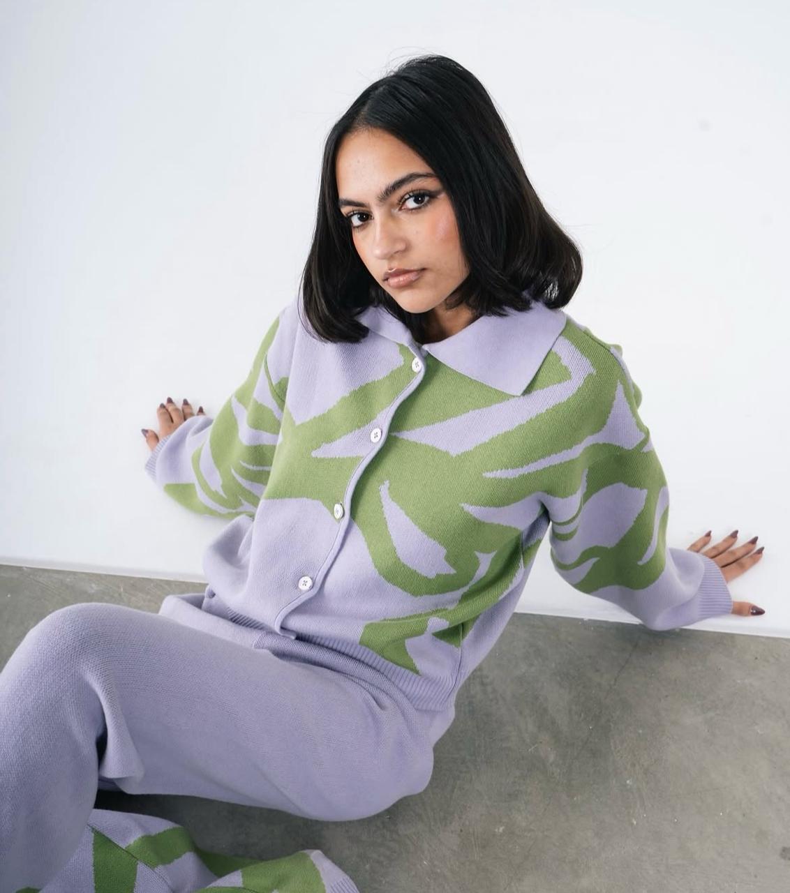 Pastel lavender base with moss‑green abstract intarsia for a fresh, gender‑neutral vibe